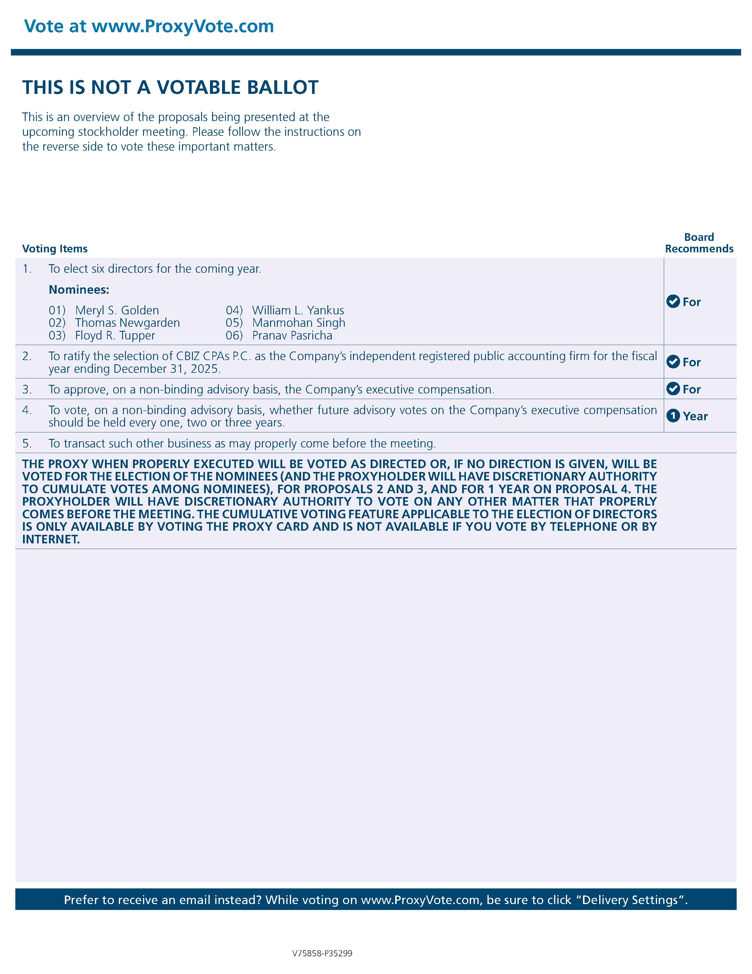 the ratification of the selection of CBIZ CPAs P.C. as our independent registered public accounting firm for the fiscal year ending December 31, 2025;