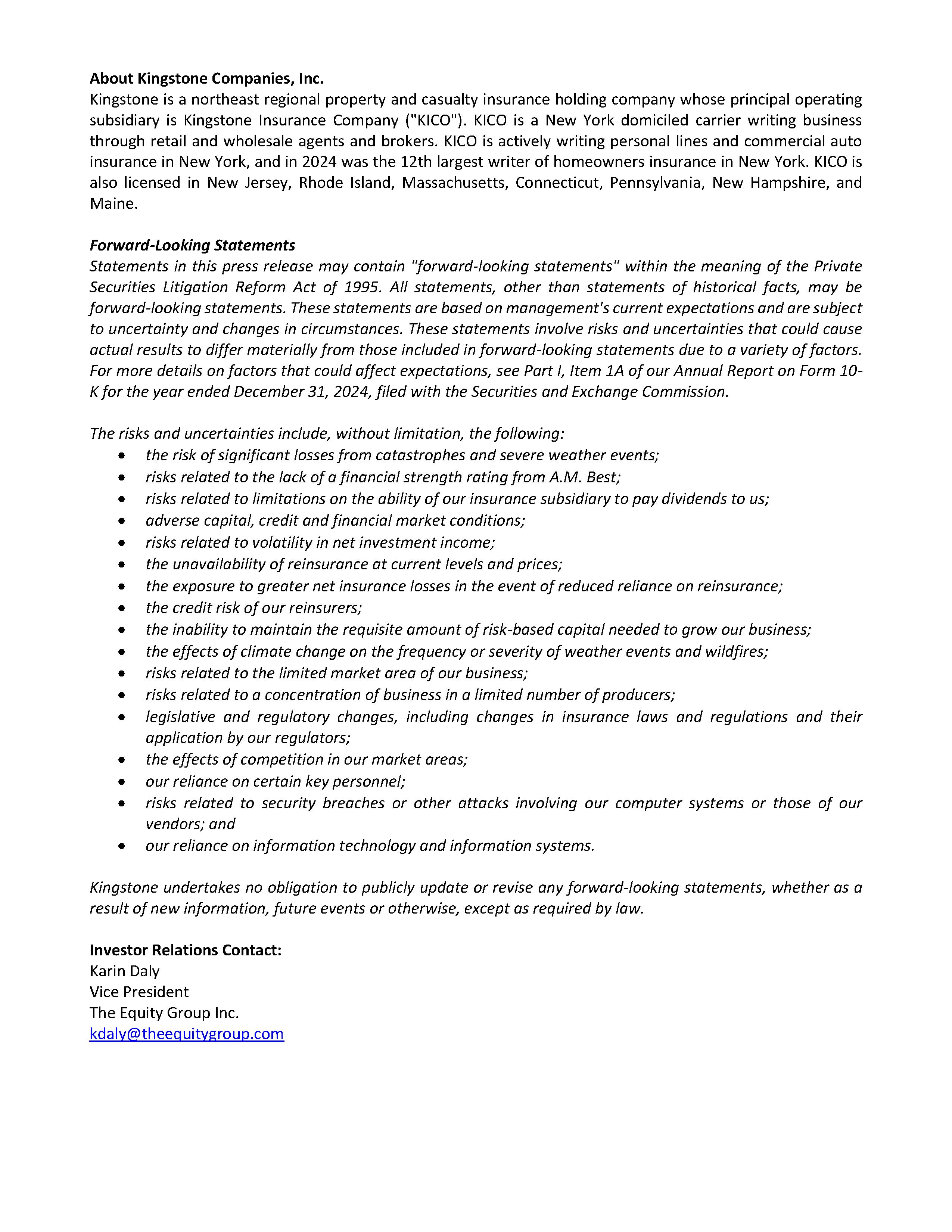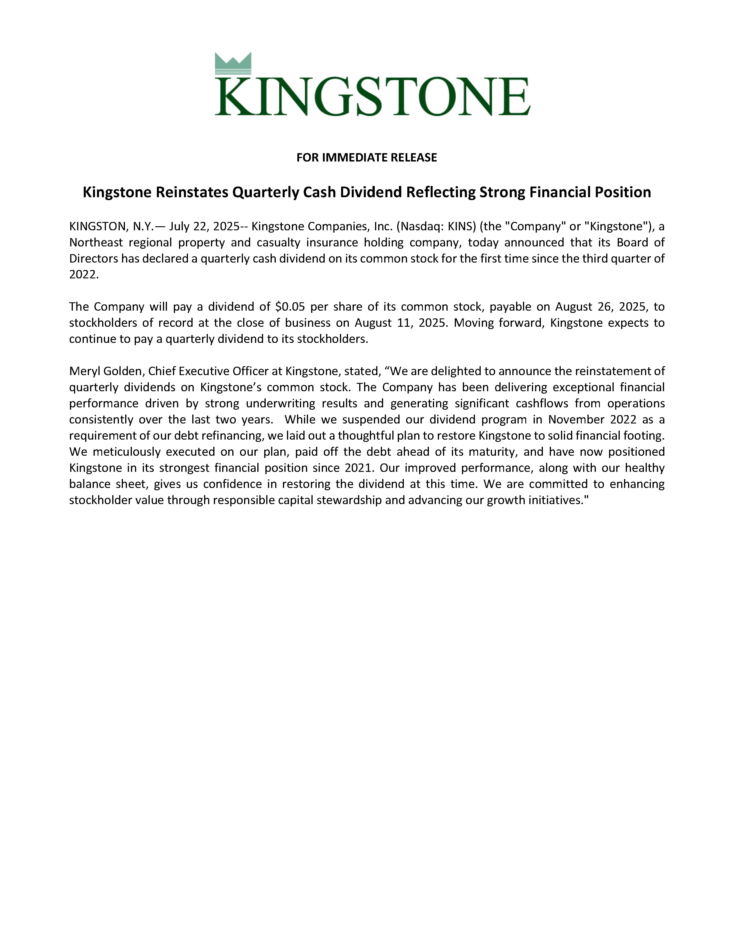 Press release, dated July 22, 2025, issued by Kingstone Companies, Inc.