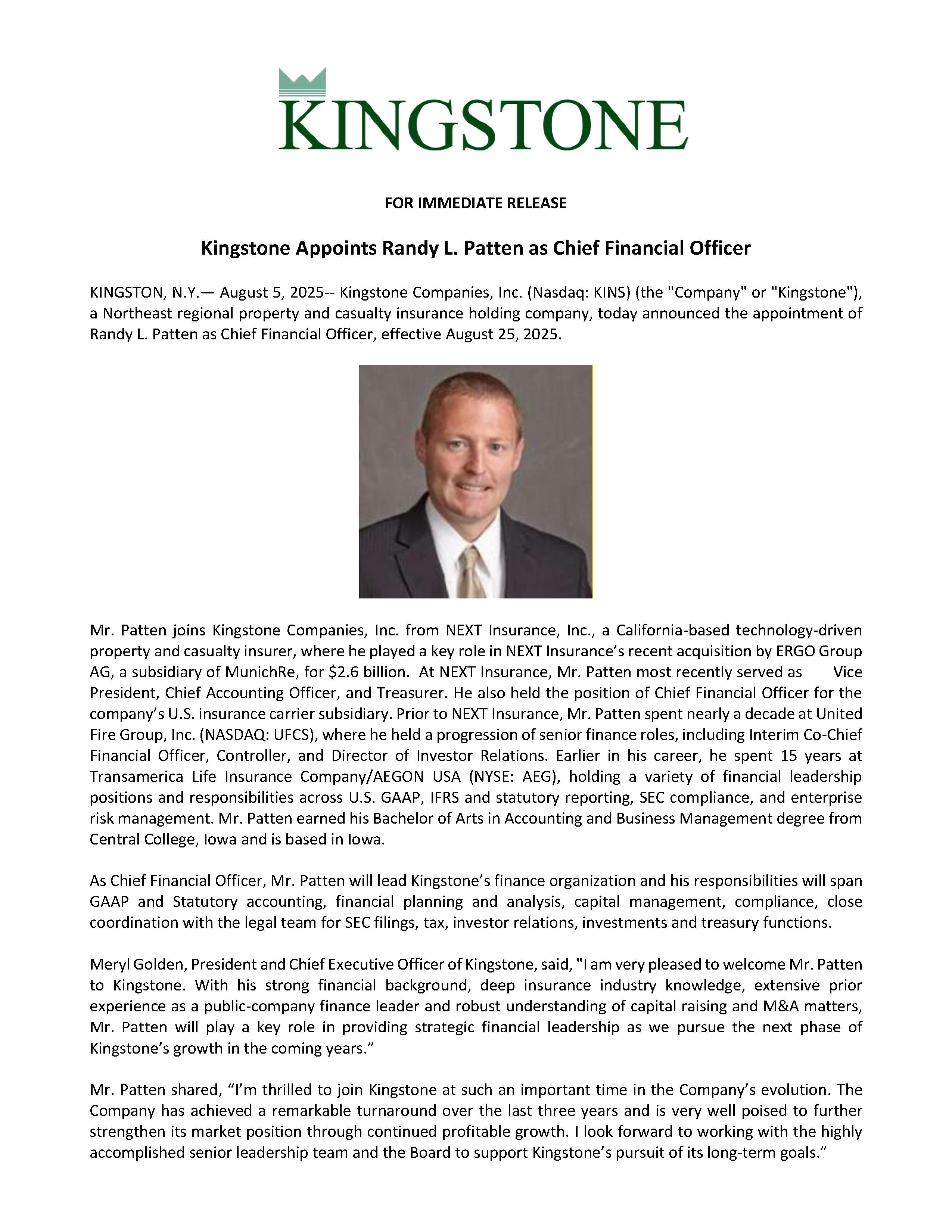 AGREEMENT, dated July 23, 2025, by and between KINGSTONE COMPANIES, INC., a Delaware corporation (the “Company”), and RANDY PATTEN (the “Employee”).