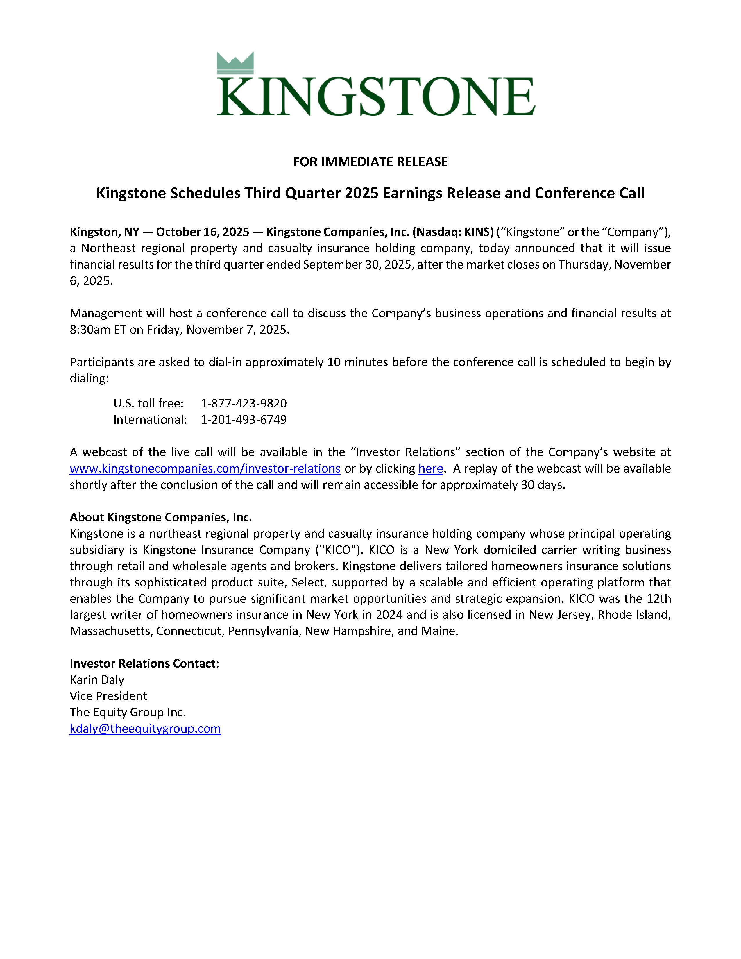 Press release, dated October 16, 2025, issued by Kingstone Companies, Inc.
