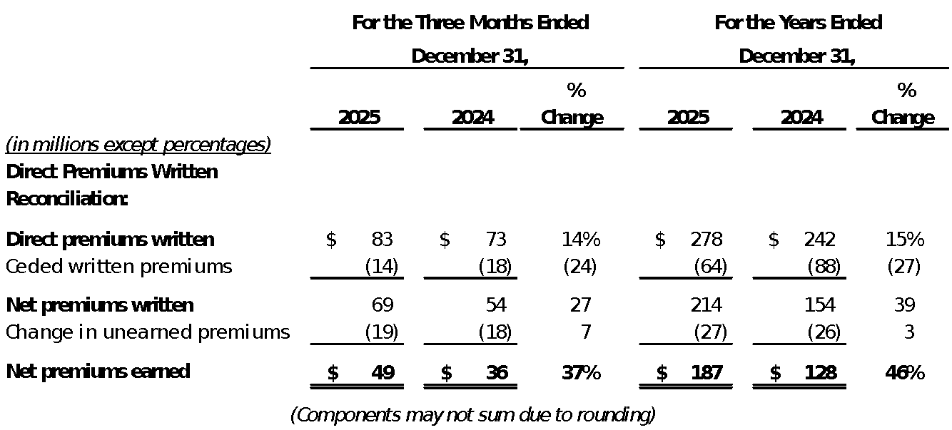 Direct premiums written represent the total premiums charged on policies issued by the Company during the respective fiscal period. Net premiums earned, the GAAP measure most comparable to direct written premiums, are net premiums written (i.e., direct premiums written less premiums ceded to reinsurers) that are pro-rata earned during the fiscal period presented. All of the Company’s policies are written for a twelve-month period. Management uses direct premiums written, along with other measures, to gauge the Company’s performance and evaluate results. Direct premiums written are provided as supplemental information, not as a substitute for net premiums earned, and do not reflect the Company’s net premiums earned.