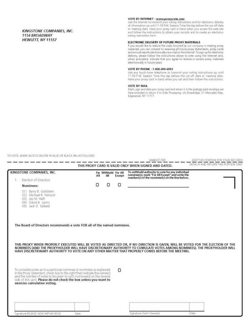 To the Stockholders of Kingstone Companies, Inc.: