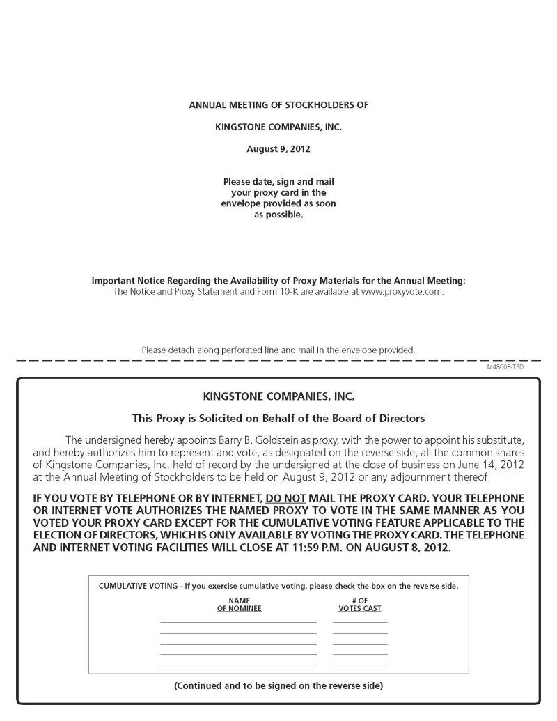 NOTICE IS HEREBY GIVEN that the Annual Meeting of Stockholders of Kingstone Companies, Inc., a Delaware corporation (the “Company”), will be held on August 9, 2012 at 15 Joys Lane, Kingston, New York 12401, at 9:00 a.m., for the following purposes: