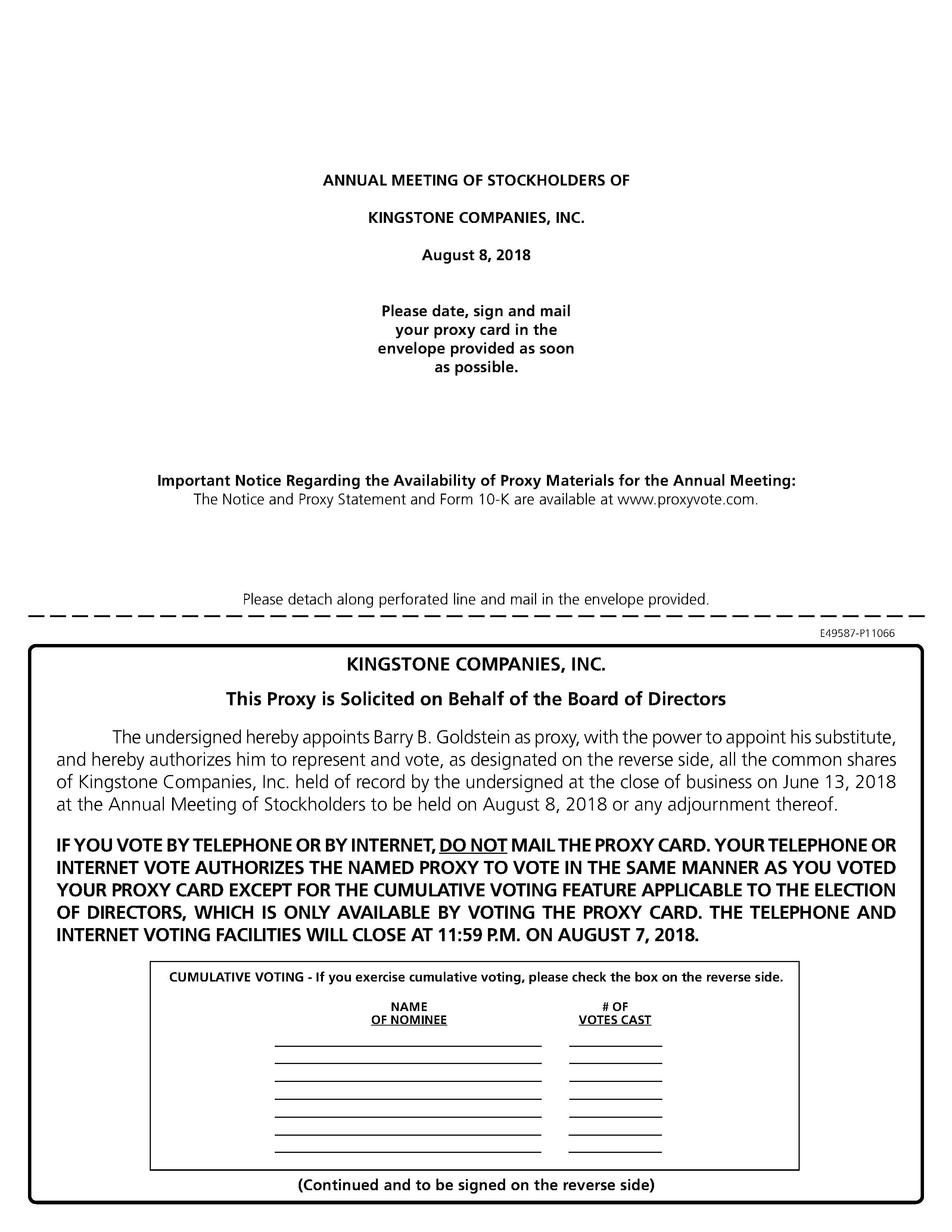 NOTICE IS HEREBY GIVEN that the Annual Meeting of Stockholders of Kingstone Companies, Inc., a Delaware corporation (the "Company"), will be held on August 8, 2018 at 15 Joys Lane, Kingston, New York 12401, at 9:00 a.m., for the following purposes: