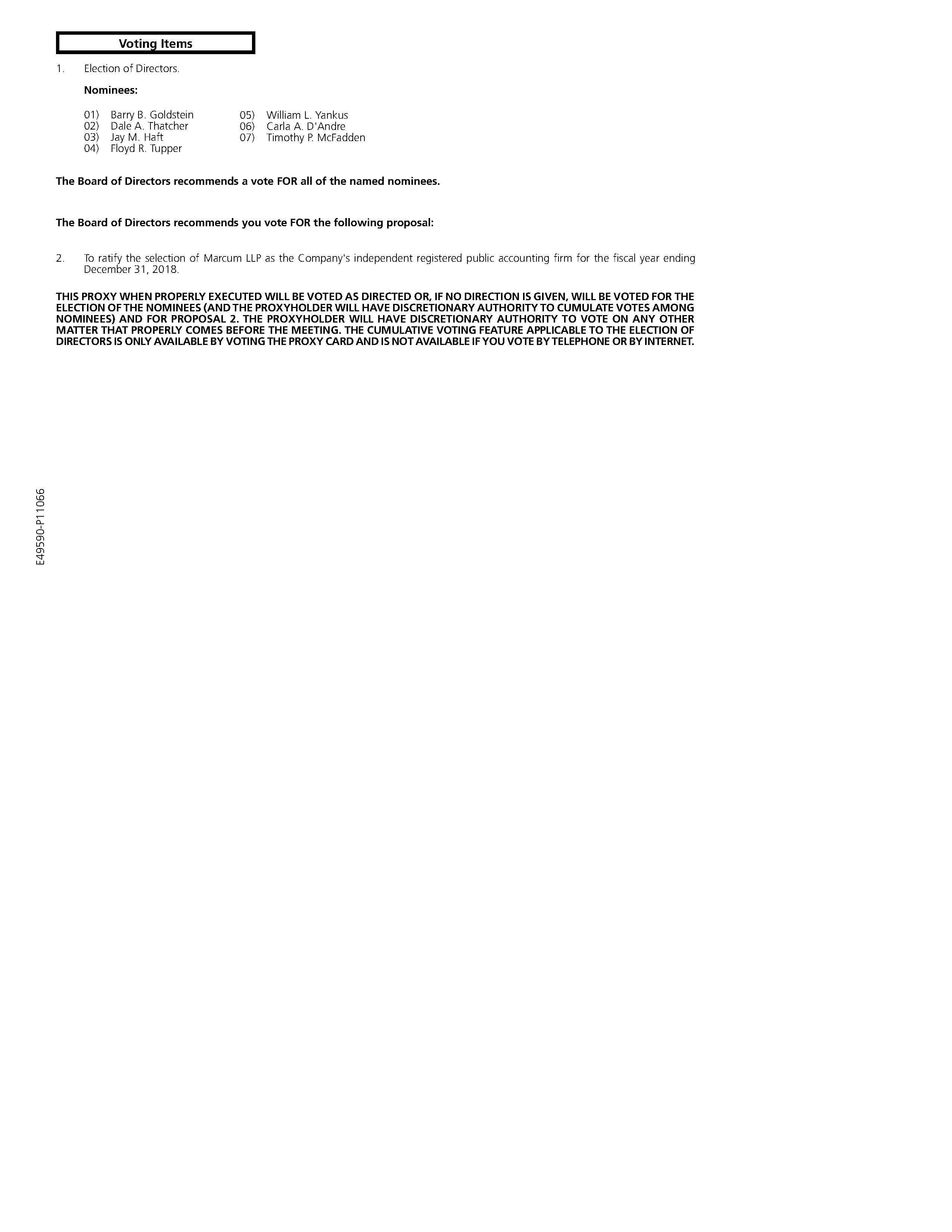 Our Restated Certificate of Incorporation provides for cumulative voting of shares for the election of directors. This means that each stockholder has the right to cumulate his votes and give to one or more nominees as many votes as equals the number of directors to be elected (seven) multiplied by the number of shares he is entitled to vote. A stockholder may therefore cast his votes for one nominee or distribute them among two or more of the nominees; however, in order to cumulate votes, a stockholder must request a proxy card (as Internet and telephone voting will not be available for such purposes). Only stockholders of record as of the close of business on June 13, 2018 will be entitled to vote. With regard to the election of directors, votes may be cast in favor or withheld. The directors shall be elected by a plurality of the votes cast in favor. Accordingly, based upon there being seven nominees, each person who receives one or more votes will be elected as a director. Votes withheld in connection with the election of one or more of the nominees for director will not be counted as votes cast for such individuals and may be voted for the other nominees.