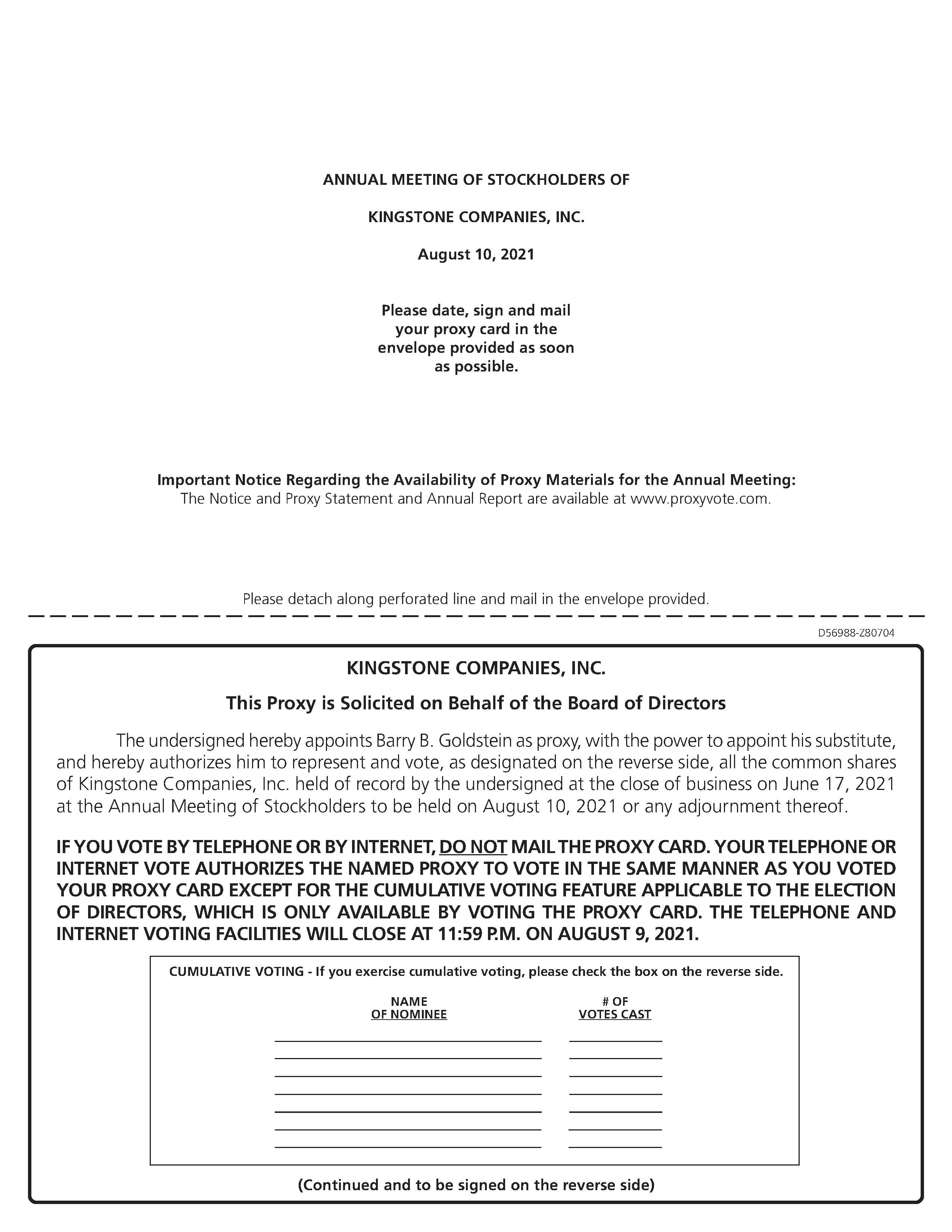NOTICE IS HEREBY GIVEN that the Annual Meeting of Stockholders of Kingstone Companies, Inc., a Delaware corporation (the “Company” or “we”),